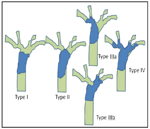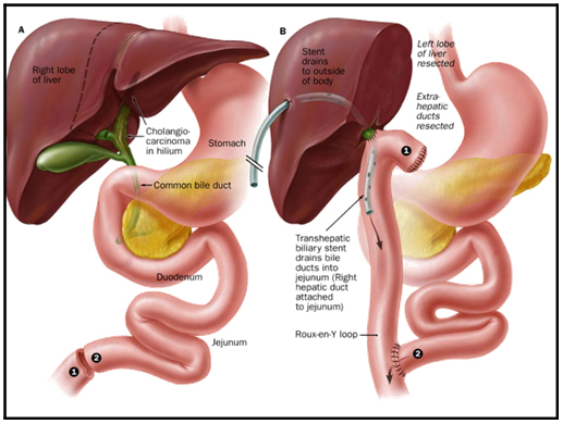 - Surgery: Major hepatectomy combined with extra hepatic bile duct resection has increased the long term survival and should be considered standard therapy. Bismuth Collarette classification helps to classify the disease and accordingly surgery is done. Usually, Bismuth-Corlette type I patients undergo Radical bile duct excision with hepaticojejunostomy. Type II & III lesions require Major Hepatectomy ( Right/ Left ) with hepaticojejunostomy.